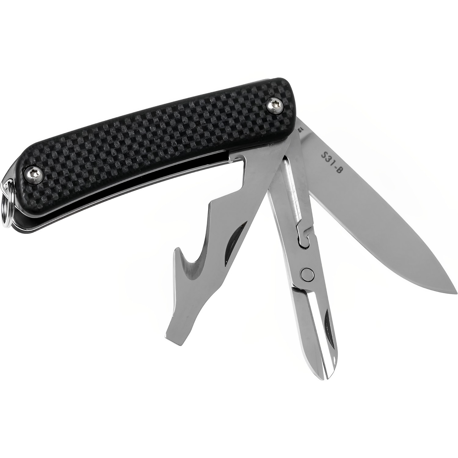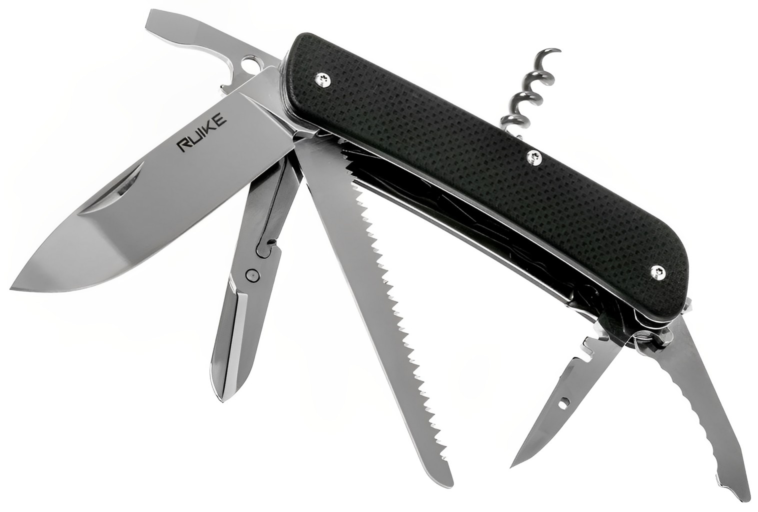 •  Нож. Он предназначен для работы на кухне, с тканями, шнурами и деревом. Ножи в мультитулах не такие крепкие, как туристические ножи с фиксированным клинком, но сопоставимы по прочности с большинством складных ножей.
